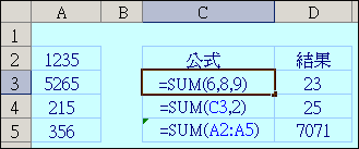 Sun函數 他是用來計算一個數字數列或儲存格參照位址的加總。 您可以直接利用它來作數字的加總,儲存格跟數字加總,或是儲存格中的內容加總。