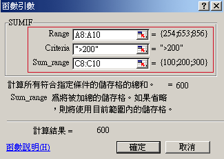 Sun IF函數 此函數是依據某特定的條件來進行篩選 您可以設定篩選的條件【>200】【>800】等等 此函數的語法 SUMIF(range,criteria,sum_range) range : 要進行篩選的儲存格範圍 criteria : 進行篩選的準則 sum_range : 實際要加總的相對應儲存格範圍。