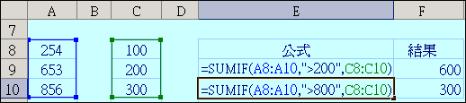 ● 在儲存格F10中篩選A8到A10中大於800的只有A10,因此加總相對應的儲存格C10,所以值為300。