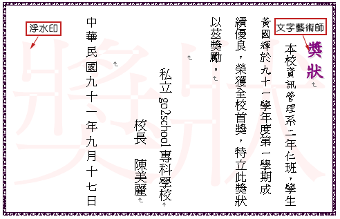 請各位同學打開練習檔,利用「文字藝術師」及「浮水印」製作以下範例。