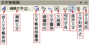 文字藝術師為製作文字效果的重要工具,利用文字藝術師我們可將文字作許多變化。首先,到功能表列選擇「檢視/工具列/文字藝術師」就會出現文字藝術師的工具列了。