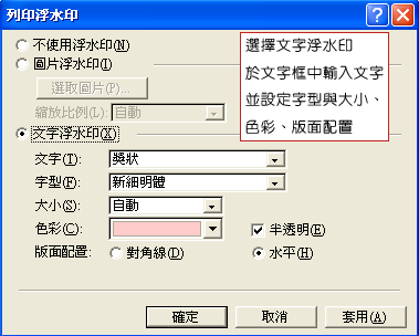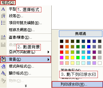 另外,利用Word功能可以製作浮水印效果,選按「格式」/「背景」/「列印浮水印」,然後選擇圖片。