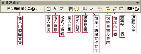 除上面的插入頁碼介紹外,我們也可以利用word中的頁首頁尾設定,輸入一些書名、日期等資料,讓讀者比較容易查詢及瀏覽。進入頁首頁尾編輯模式後,出現頁首及頁尾工具列,工具列中有許多的編輯按鈕,如圖說明: