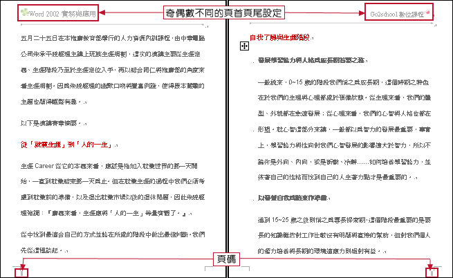 以下示範如何設定頁首及頁尾;另外,奇偶頁數不同的頁首設定。