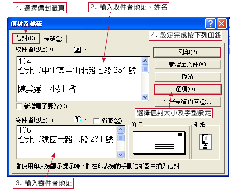 信封的製作功能輔助使用者輸入信封資料,完成後,再產生一個與所設定信封尺寸相同的文件。
