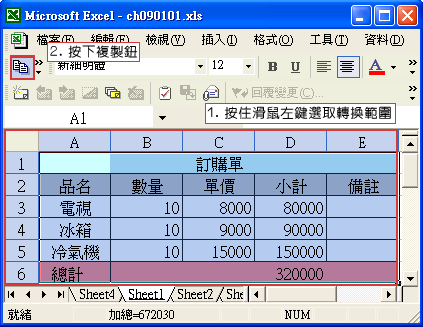 我們使用前一小節的方法可以直接插入Excel工作表物件,但在word中我們也可以直接將工作表轉換為表格的格式,在word中再進行編輯的工作。因此,首先我們必須先開啟Excel,並選取要轉換為表格的範圍,按下「複製」鈕。