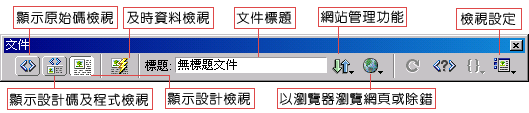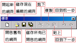 標準工具列:各位同學執行「檢視/工具列/標準」後,即可開啟「標準工具列」,「標準工具列」中提供了編輯網頁時常用到的功能。