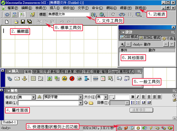 請各位同學執行「開始/程式集/Macromedia/Macromedia Dreamweaver Mx」,開啟Dreamweaver Mx的工作環境。在這裡我們要說明的是工具列為浮動面版,如果我們將整個工作視窗放大或者是縮小都不會改變浮動面版的位置。