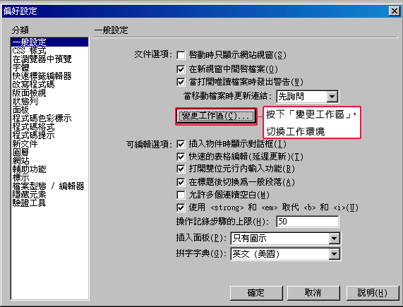 請各位執行「編輯/偏好設定」,按下如下圖「變更工作區」鈕。
