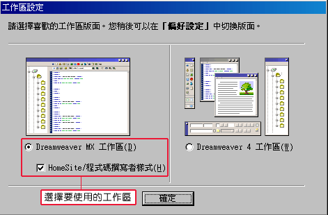 出現「工作區設定」,我們選擇「Dreamweaver Mx工作區」後,按下「確定」鈕。這樣下次開啟時,工作區就會設定為這個版本了。