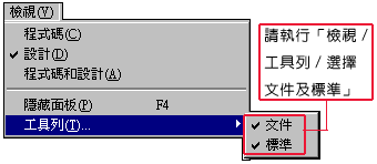 文件工具列:請執行「檢視/工具列/文件」,就可以開啟文件工具列了。