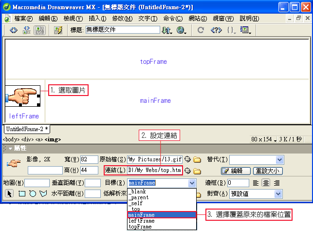 請先選取左頁框中的一個圖示按鈕,然後按一下屬性面板中【連結】選項右方的按鈕,選擇超連結的檔案。接著在屬性面板中的【目標】中,選擇網頁連結的方式,這就決定您的網頁跳出的方式,也就是頁框連結中最重要的一部份。
