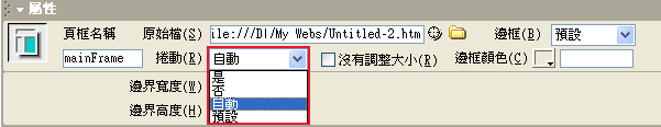 在一般預設的情況之下,Frame是不會有垂直捲軸的,不過,仍可依需要,在Frame屬性面板上加以設定。請先在Frames面板中,選擇要加入捲軸的Frame,接著會在屬性面板中出現此塊Frame的屬性,接著在面板中的【
