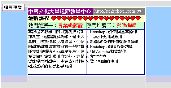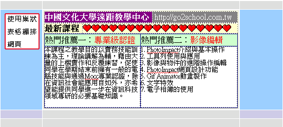 巢狀表格顧名思義,就是表格中再插入表格。她的最大作用就是方便網頁編排。而巢狀表格可以做的相當漂亮複雜,接下來就請同學先看看圖型,想想看這個表格要如何製作。接下來請同學點選動畫示範,我們實際來製作看看。