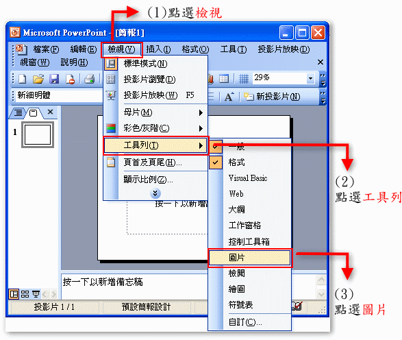圖片工具列在PowerPoint中預設是沒有開啟的,如果您的PowerPoint還尚未開啟圖片工具列,請按照下圖開啟圖片工具列。