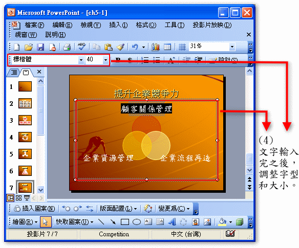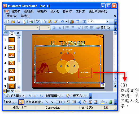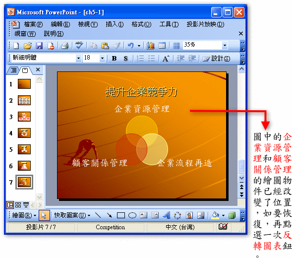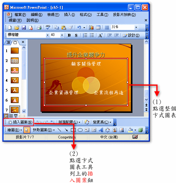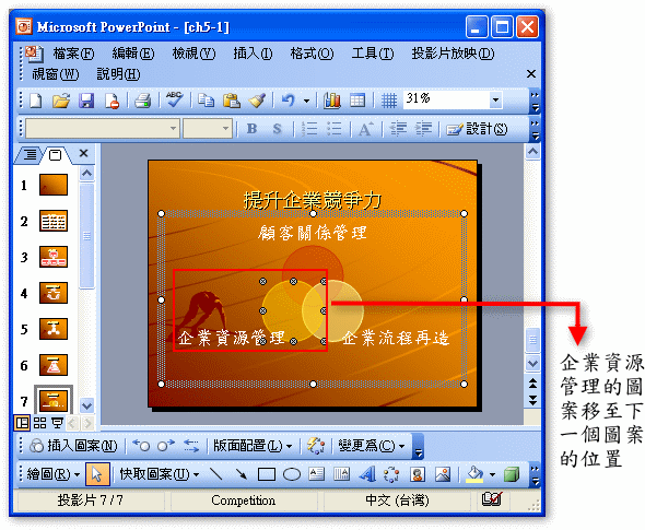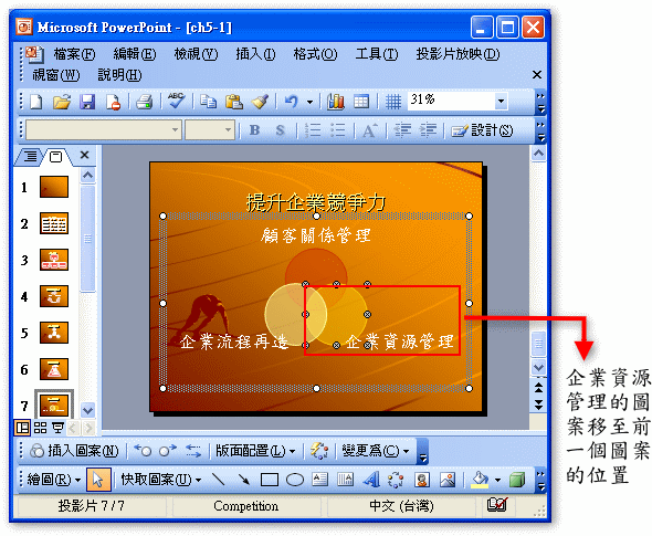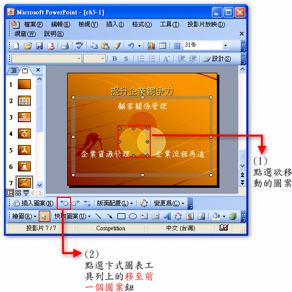 請各位學員先點選欲移動的圖表物件,然後點選卞式圖表工具列上的移至前一個圖案鈕。