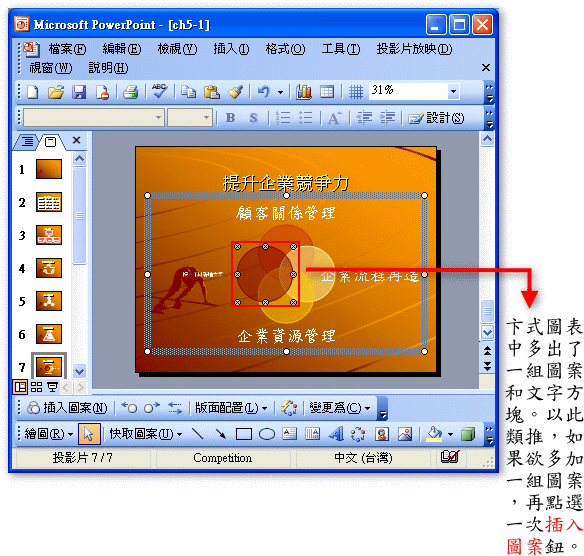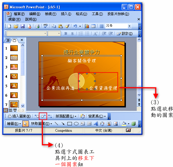 接下來再請各位學員點選一個圖案物件,然後點選卞式圖表工具列的移至下一個圖案鈕。