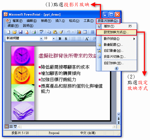 畫筆的顏色除了預設的顏色之外,各位學員還可以選擇其他不同的顏色,來滿足畫筆註解的需求。請各位學員點選功能表列上的投影片放映,然後再點選設定放映方式。