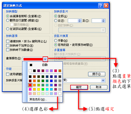出現設定放映方式視窗,下拉畫筆顏色的選單,選擇您所想要改變的色彩。