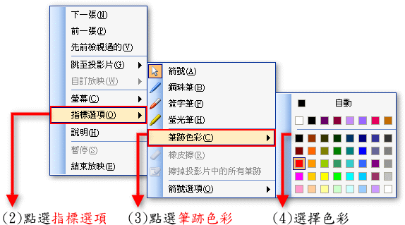 按下滑鼠右鍵顯示快顯功能表,然後點選指標選項,再點選筆跡色彩,就可以變更色彩,而不需要結束投影片的放映來進行畫筆色彩的設定。