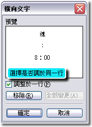 橫向文字的功能可用在直書的日期格式或是英文單字,因為日期和英文單字都是較適合用橫書方式排列。首先,選取要做橫向文字的文字,然後,點選 「格式」 /「亞洲方式配置」/「橫向文字」 ,即會出現橫向文字的對話框,勾選是否要調整於一行,按確定,即會出現橫向文字的效果。
