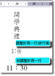 並列文字的功能可以將文字並列,首先,先選取要並列的文字,然後點選 「格式」/「亞洲方式配置」 /「並列文字」 ,即會出現並列文字的對話框,選擇是否要以括弧 包住,再點選確定即可。