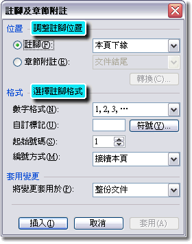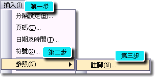 二、點選「插入」/「參照」/「註腳」,即可開啟「註腳及章節附註」視窗。