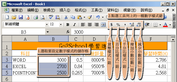 在儲存格中輸入數字後,可以依自己所需設定數字的類別,另外也可以透過工具列的按鈕來設定數字的樣式,現在我們就來學習如何設定數字樣式吧!