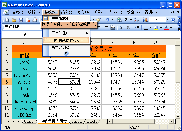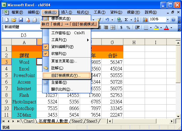 首先,將工作表依自己的需求做版面的設定(隱藏B、C欄),然後到功能表執行「檢視」→「自訂檢視模式」。