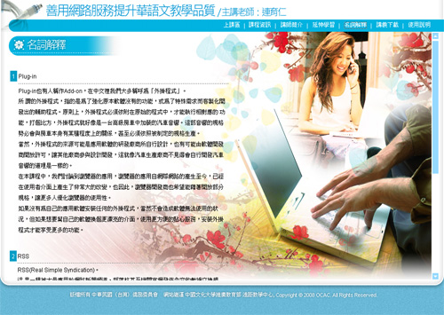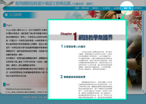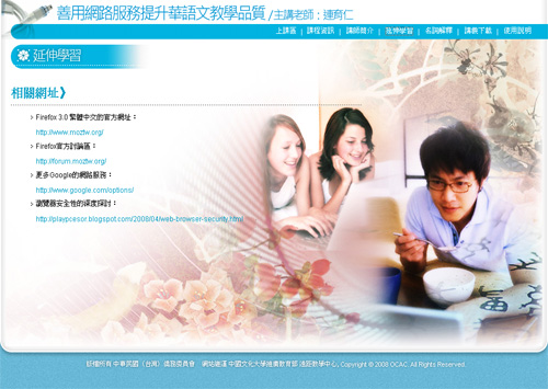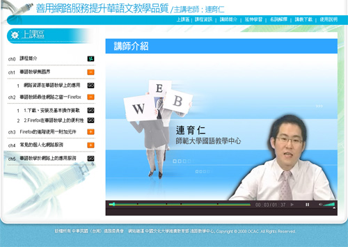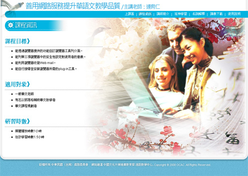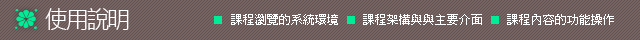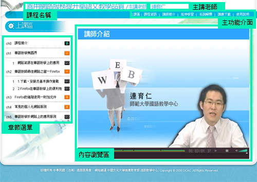 本年度華語師資培訓班系列課程,每門課程可分成以下幾個部分,並透過主功能介面在各單元間切換。