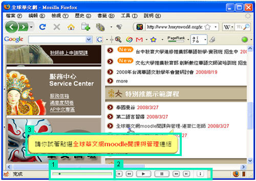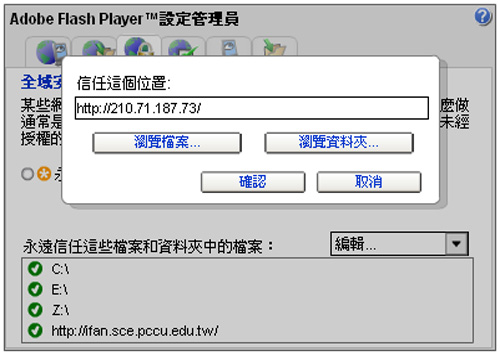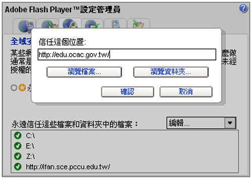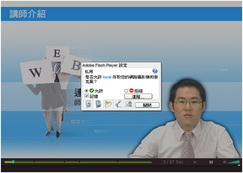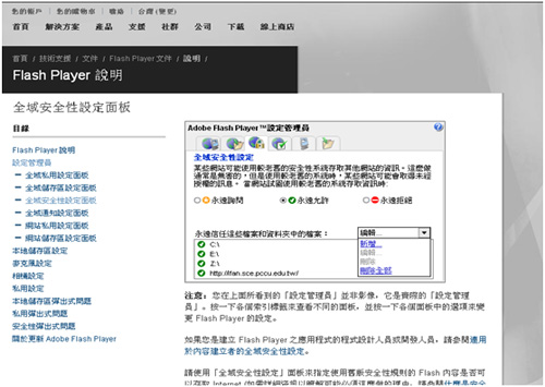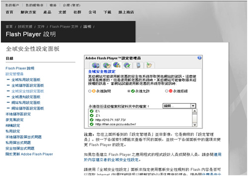 在進入課程單元之後,若無法順利閱讀課程內容,很可能是因為Flash的安全性設定所導致,在此提供您解決的方式。