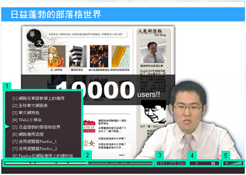 進度的控制按鈕,除了播放暫停的基本功能以外,使用者可依照自身的學習狀況,跳過目前階段或是重覆已經進行過的單元。